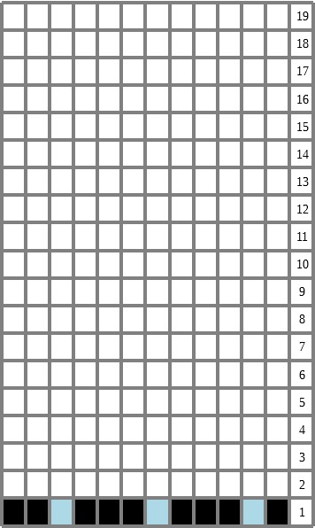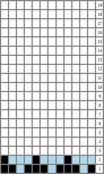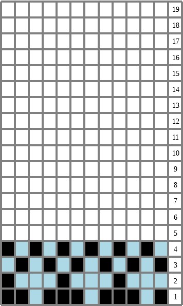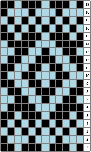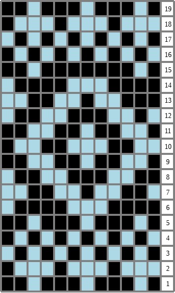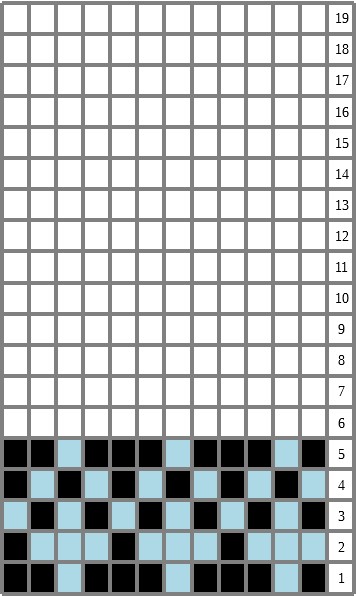 Eine Reihe im Zählmuster erfordert also zwei Strickreihen beziehungsweise Schlittenquerungen über das Nadelbett. Bei der ersten Querung (von rechts nach links) werden nur die Nadeln der einen Farbe abgestrickt. Beim zweiten Mal (von links nach rechts) die Nadeln der anderen Farbe.