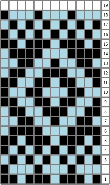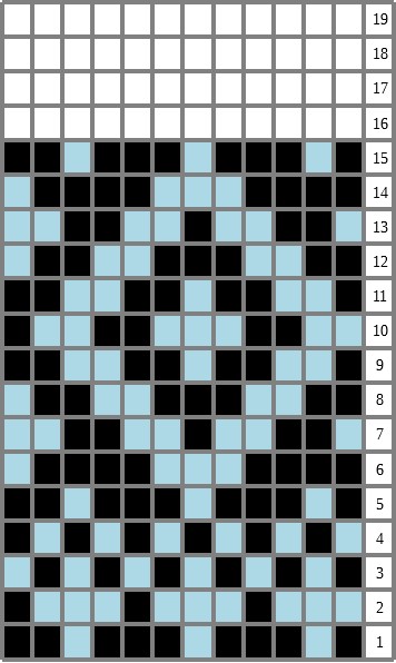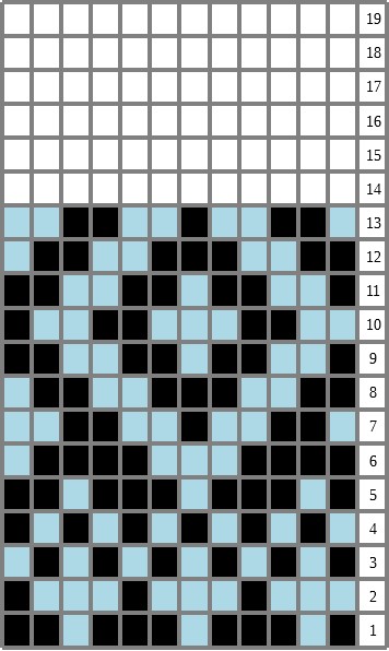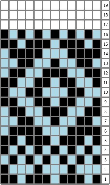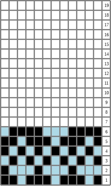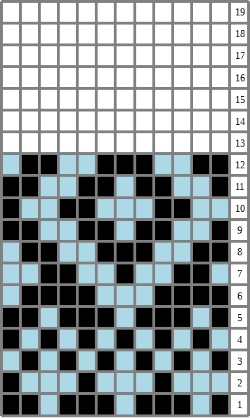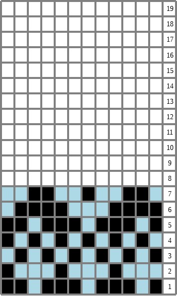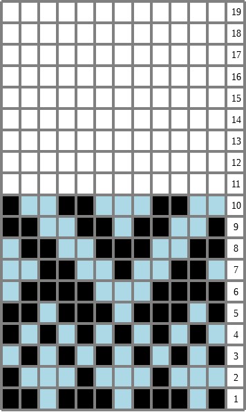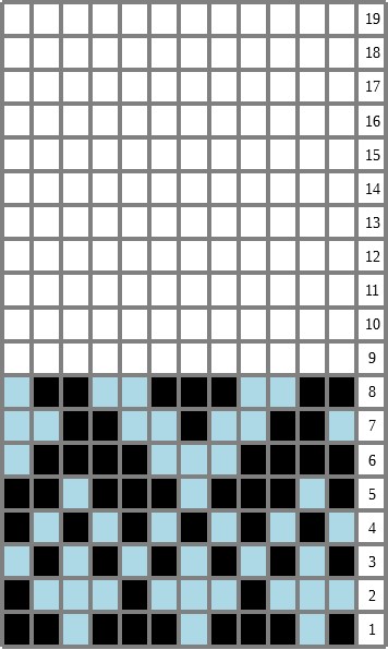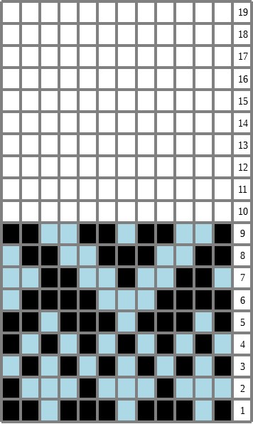 Nach diesem Schema geht es im Fair-Isle-Muster immer weiter nach oben. Steht der Schlitten rechts, werden die Nadeln in Stellung gebracht wie es das Zählmuster vorsieht. Welche Nadeln dabei in Strickstellung bleiben, und welche in Ruheposition geschoben werden müssen, hängt von der Farbe im Nüsschen ab. Steht der Schlitten links, wird vor dem Stricken die Farbe im Nüsschen gewechselt. Das kurz gefasste Mantra lautet also: Steht der Schlitten rechts, Nadeln einstellen Steht der Schlitten links, Farbe wechseln.