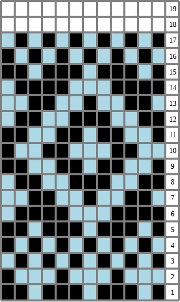 Dann kommt mit Hellblau die zweite Farbe ins Spiel. Sie wird auf der linken Seite des Fadenhalters eingefädelt und es folgt der zweifarbige Musterteil wie in der Zählschrift (siehe oben) abgebildet.